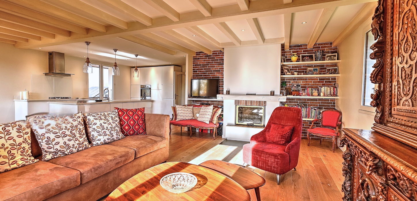 Une grande pièce de vie de 55m2, refaite récemment, comprenant une belle cuisine ouverte sur le salon - séjour, pièce lumineuse grâce à sa triple exposition.